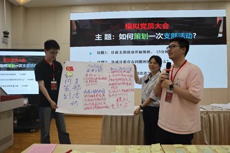 太阳成集团122ccvip教育培训部第二党支部书记史梅就“如何策划一次支部活动”进行讲解,并组织模拟党员大会,随机选取三名学员组成支委,并与现场学员充分互动,围绕开展支部活动的难点及其原因展开深入交流,并就如何提升支部活动质量展开讨论。
