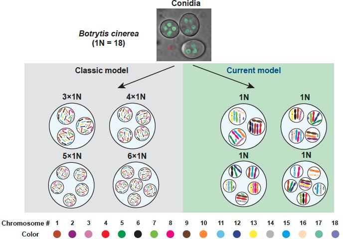 图2: 灰霉菌(B. cinerea)细胞核内染色体分布模型对比图。在经典模型中,分生孢子内的多个细胞核均含有完全相同的18条单倍体染色体组(1N=18);而在新模型中,18条染色体以不规则方式分配至同一个孢子的不同细胞核内。荧光显微镜图像显示的是灰霉菌组蛋白 H1-eGFP菌株分生孢子中的细胞核。