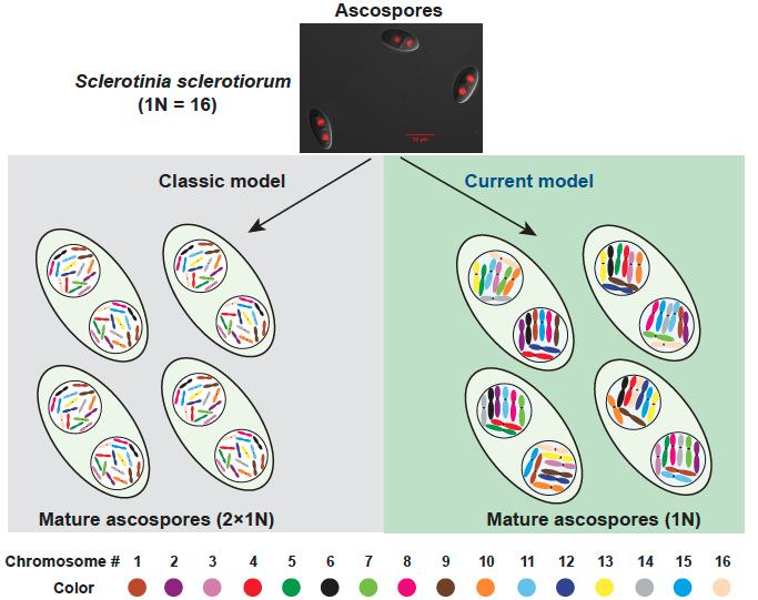 图1: 核盘菌(S. sclerotiorum)细胞核内染色体分布模型对比图。在经典模型中,子囊孢子内的两个细胞核均含有完全相同的16条单倍体染色体组(1N=16);而在新模型中,16条染色体以不规则方式分配至两个细胞核内。荧光显微镜图像显示的是核盘菌SsH4-mCherry菌株子囊孢子中的细胞核。