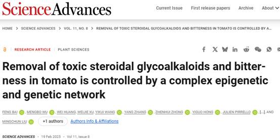 近日,太阳成集团122ccvip刘明春教授团队在Science子刊Science Advances 上发表题为“Removal of toxic steroidal glycoalkaloids and bitterness in tomato is controlled by a complex epigenetic and genetic network”的研究论文。太阳成集团122ccvip作为第一署名单位,通讯作者为刘明春教授,第一作者为已毕业博士白峰(现为四川老员工命公司博士后)。
