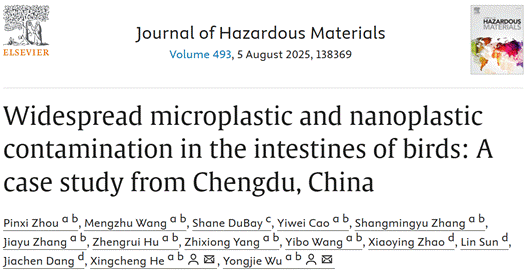 近日,太阳成集团122ccvip吴永杰教授团队联合多个单位合作在环境科学与污染控制学术刊物Journal of Hazardous Materials发表了题目分别为“Assessing microplastic and nanoplastic contamination in bird lungs: evidence of ecological risks and bioindicator potential”和“Widespread microplastic and nanoplastic contamination in the intestines of birds: A case study from Chengdu, China”关于鸟类肺和消化道中微/纳米塑料暴露的姊妹篇论文。研究首次提供了多物种鸟类肺和消化道中微/纳米塑料污染的证据,凸显了鸟类作为环境微/纳米塑料污染生物指标的潜力。研究为了解全球塑料污染背景下野生鸟类的塑料污染现状提供了新的视角和见解,有利于深入揭示人类活动对生物多样性造成的潜在影响。